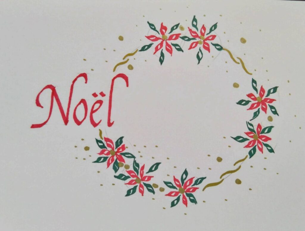 文字は「Noël」、そしてポインセチアのリースを描く課題でした。